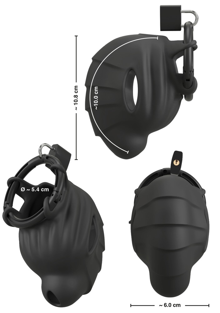Der Käfig ist abschließbar und wird mit einem Vorhängeschloss sowie zusätzlichen Einwegschlössern geliefert – ideal für kontrollierte Spiele im Rahmen von Dominanz und Unterwerfung. Eine integrierte Öffnung im unteren Bereich ermöglicht zudem weiterhin hygienisches Tragen im Alltag.