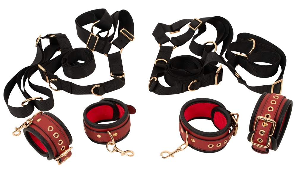 - Setumfang: 5-teilig (1 Gurtsystem, 2 Handfesseln, 2 Fußfesseln)