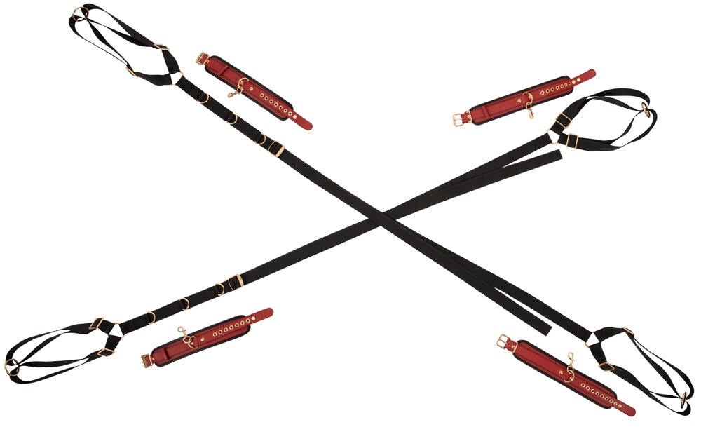 Das Herzstück bildet ein stabiles, verstellbares X-Gurtsystem, das sich einfach an den Ecken der Matratze oder an einer Tür befestigen lässt. Über integrierte Metallringe werden die Fesseln sicher eingehängt, wodurch eine gleichmäßige 4-Punkt-Fixierung möglich ist.