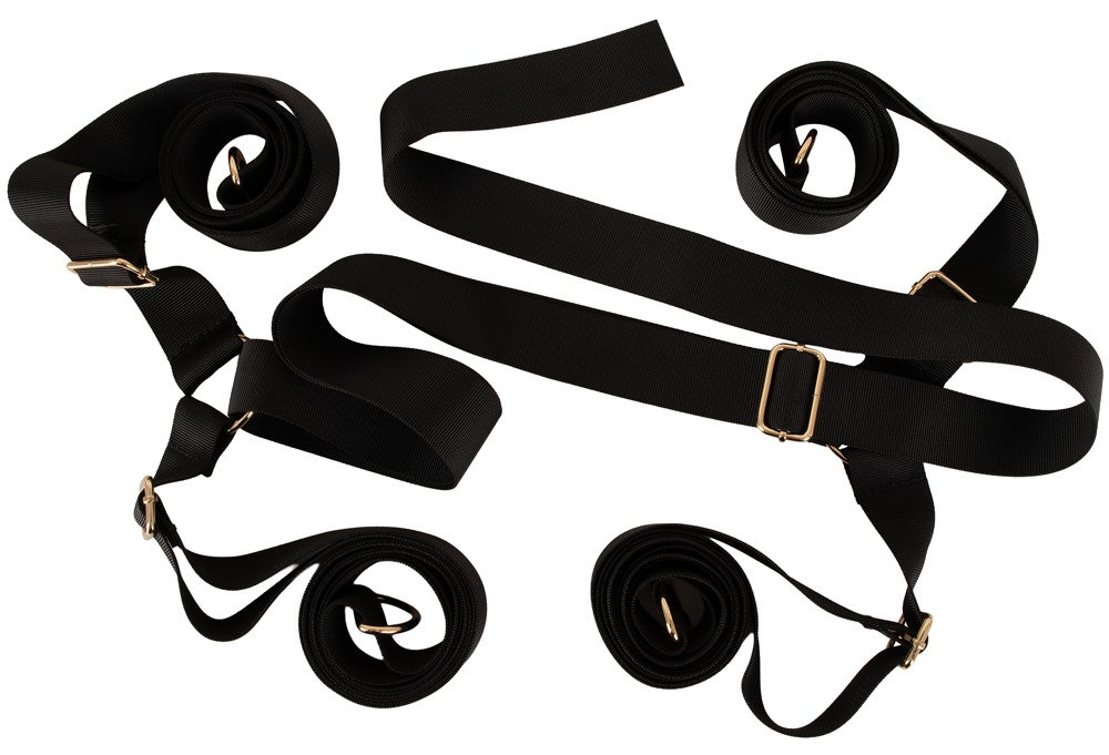 Das verstellbare X-Gurtsystem sorgt für sicheren Halt und lässt sich flexibel an unterschiedliche Bettgrößen anpassen. Die gepolsterten Hand- und Fußfesseln werden über stabile Karabinerhaken an den Gurten befestigt und bieten angenehmen Tragekomfort bei gleichzeitig zuverlässiger Fixierung.