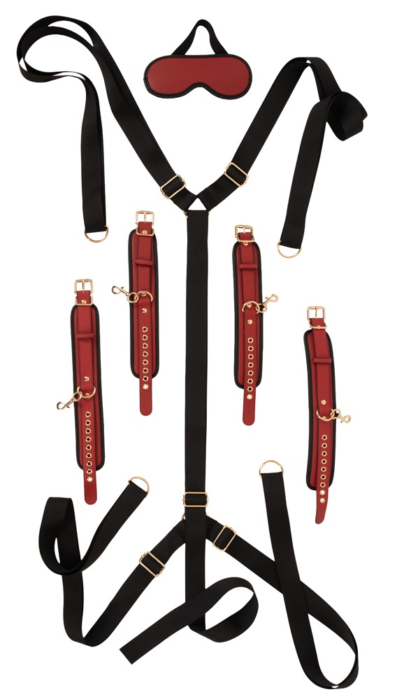 • Setumfang: 6-teilig (1 Gurtsystem, 2 Handfesseln, 2 Fußfesseln, 1 Augenbinde)