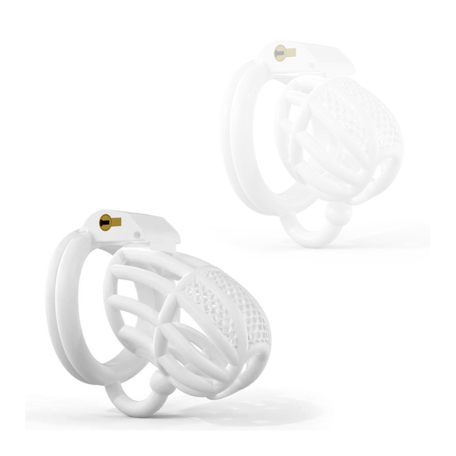Weißer Keuschheitskäfig mit einer Länge von 7,5 cm und einer Breite von 3,1 cm.