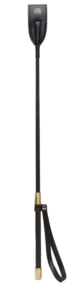 Hochwertige elegante Gerte Bound to You Riding Crop von Fifty Shades of Grey mit Schlagfläche aus stilvollem Lederimitat und antikgoldfarbenen Details. Stabiler langer flexibler Griff mit Hand-/Aufhängeschlaufe für kontrollierten sicheren Schwung beim lustvollen Schlagen.