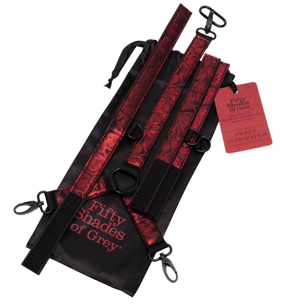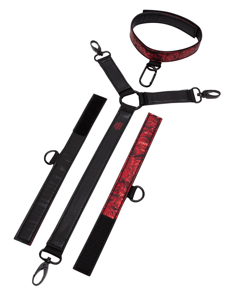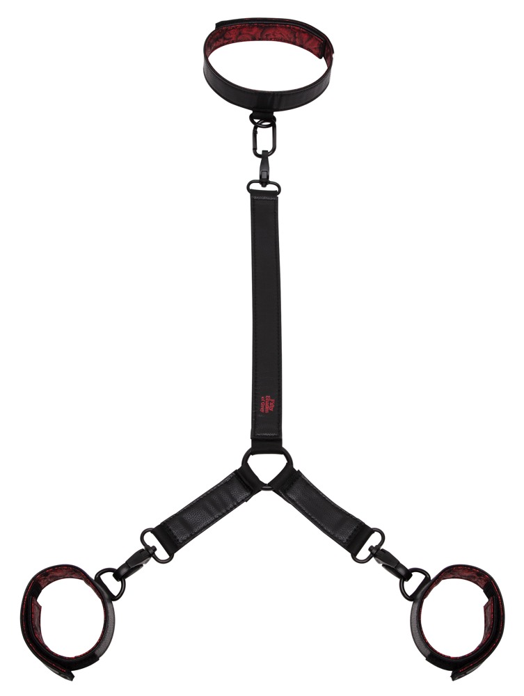 Die Hals- und Handfessel Sweet Anticipation Collar and Wrist Cuffs von Fifty Shades of Grey sorgt für die wirkungsvolle Fixierung der Hände vor oder hinter dem Körper. An dem Mittelsteg werden die Hals- und die Handfesseln mit ihren D-Ringen in die Clipkarabiner eingehakt. Die bequem gepolsterten Manschetten sowie der Mittelsteg sind beidseitig tragbar: Eine Seite in schwarzer Lederoptik, andere Seite mit Satin im schwarz/roten Rosendesign. Die Fesseln sind mit Klettverschlüssen schnell angelegt und im Umfang passend verstellbar.