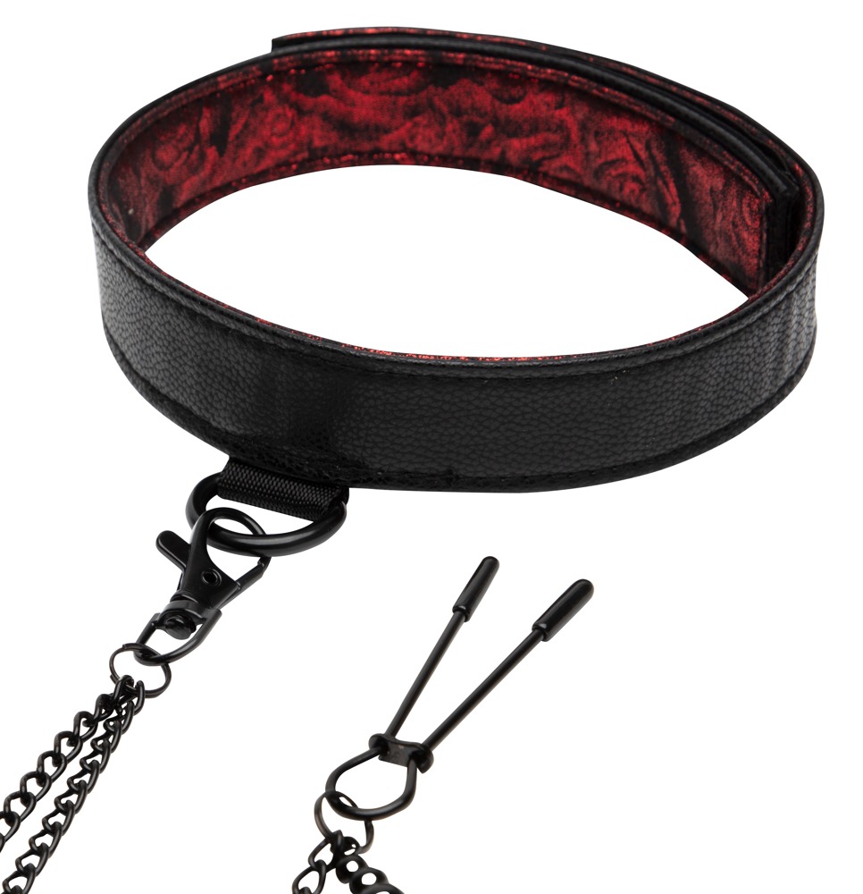 Beidseitig tragbare Halsfessel Sweet Anticipation Collar Nipple Clamps von Fifty Shades of Grey mit Nippelklemmen an Ketten. Eine Seite der Halsfessel in schwarzer Lederoptik, andere Seite mit Satin im schwarz/roten Rosendesign. Komfortabel gepolstert und mit Klettverschluss passend verstellbar. Die Ketten mit den Nippelklemmen sind von der Halsfessel dank kleinem Karabiner abnehmbar. Die Klemmen sind in ihrer Druckstärke mit Schieberingen justierbar.