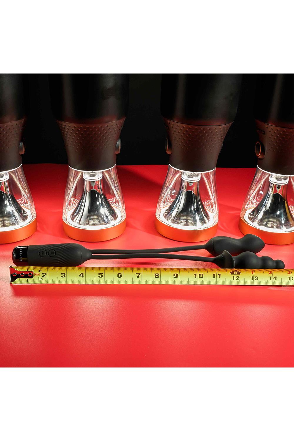 Dieses Spielzeug mit Doppelmotor verfügt über zwei vibrierende Formen – einen Perlenplug und einen Mini-Vibrator, die jeweils durch eine flexible Schnur verbunden sind. Der Rundstecker besteht aus 3 Glühbirnen, die sich nach und nach zu einem breiten Sicherheitssockel vergrößern. Der klobige Mini-Vibe verjüngt sich in der Mitte und endet mit einer abgeflachten, stumpfen Spitze. Ein USB-Stecker ist ordentlich unter der abschraubbaren Kappe des strukturierten Griffs untergebracht.