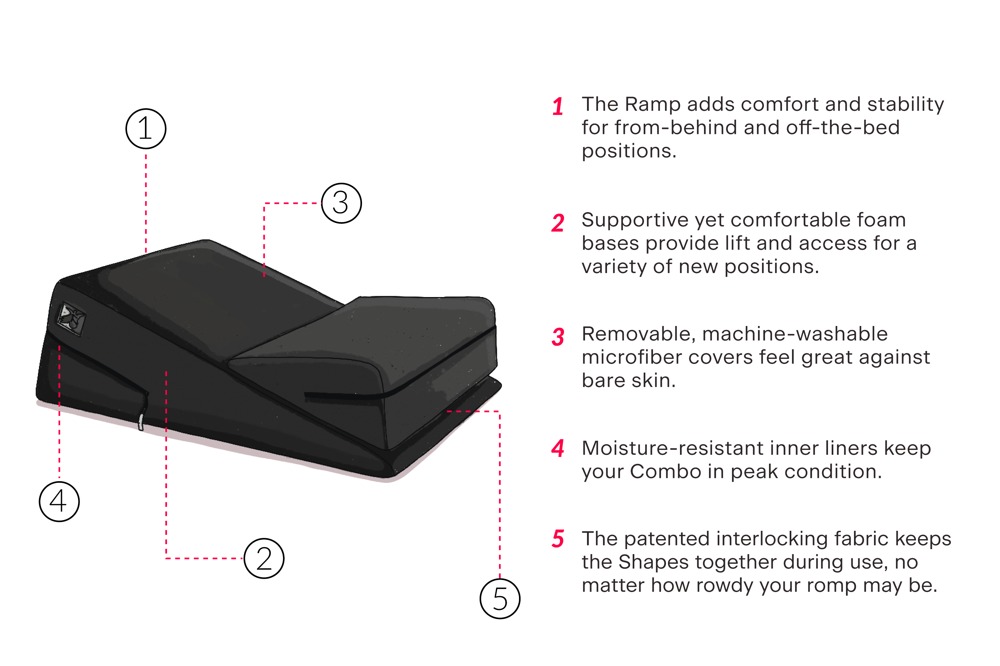 2 verschieden große, ergonomisch keilförmige Liebeskissen im Set Wedge/Ramp Combo von Liberator. Mit weichen Mikrofaserbezügen, die rutschfest aufeinander haften. So kann das kleine Keilkissen individuell auf dem großen Keilkissen platziert werden. Beide Kissen sind selbstverständlich auch einzeln verwendbar. Die beiden festen Keilkissen sind die perfekte und komfortable Unterstützung bei Sex-Stellungen und oralen Spielarten.