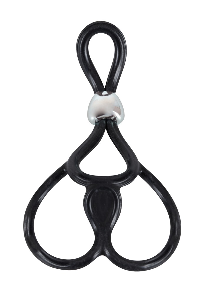 Penisring mit zwei Hodenringen (Ø je ca. 3 cm, dehnbar). Penisring durch Schiebe-Perle individuell verstellbar. Gesamtlänge ca. 13 cm. Schwarz.