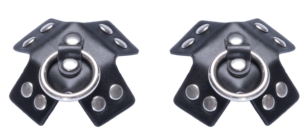 Nipple Sticker SM von Cottelli ACCESSOIRES als klassisches schwarzes Kreuz aus stilvollem Lederimitat mit Nietenbesatz und (Fessel-) Ring. Zum Aufkleben – mehrfach verwendbar, wenn Schutzfolie zur Aufbewahrung wieder aufgeklebt wird.