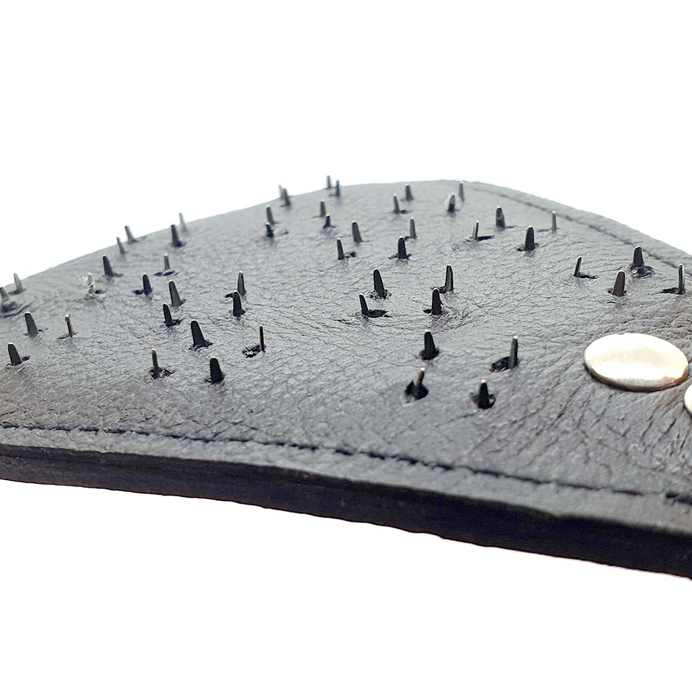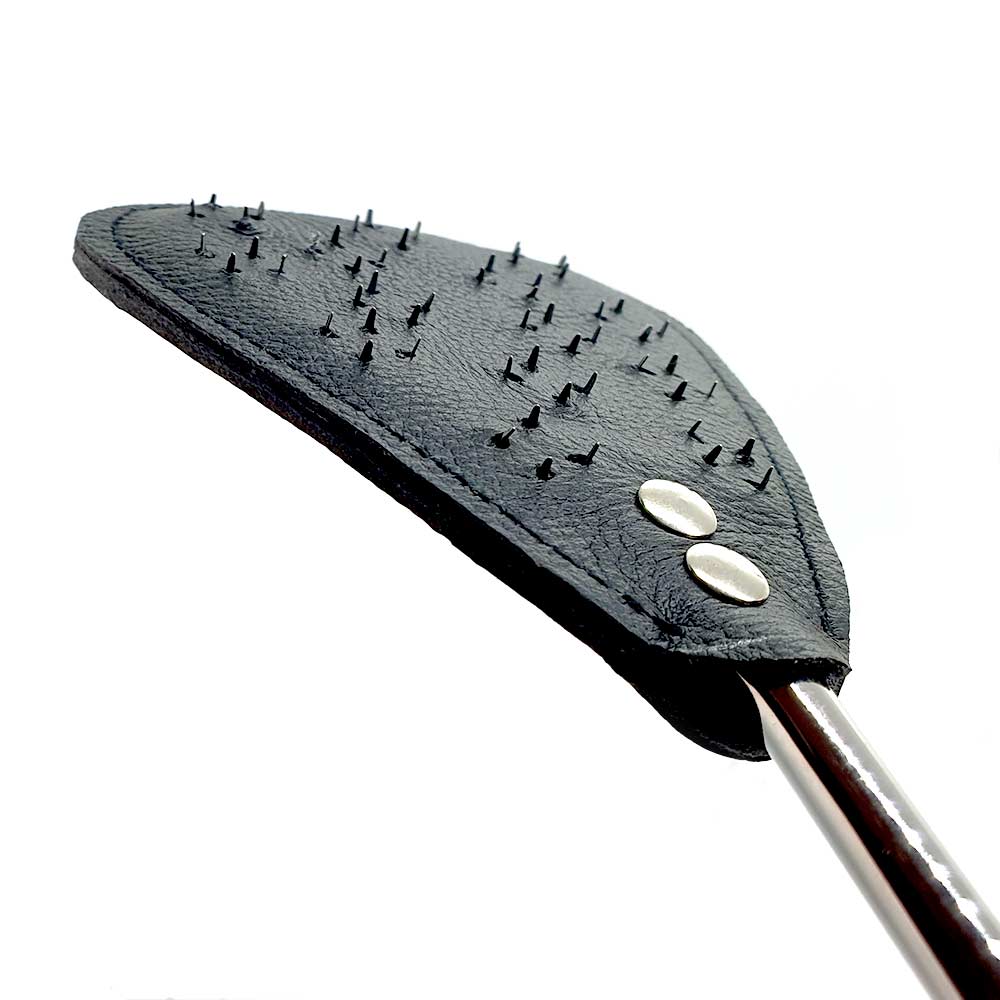 The tricky thing about this riding crop is the leather tab at the end. One side is plain and smooth, the other is studded with rather sharp metal pins – so sharp that they can pierce the skin (even if only superficially).