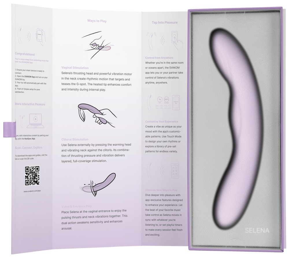 Die Wärme sowie die pulsierenden Vibro-Stöße sind in 5 Modi und 5 Intensitäten direkt am Toy bequem per Knopfdruck steuerbar. 2 Motoren sorgen zuverlässig für Power – ganz leise und diskret! Für noch mehr Spielmöglichkeiten sind mit der SVAKOM-App auf dem Smartphone neben der Fernsteuerung und Touch Mode auch individuelle Modi-Anpassungen und Synchronisation zu Musik und Sound sowie visuellen Inhalten (Videos) möglich. Auch perfekt für Fernspiele und Interaktionen mit dem Partner oder der Partnerin.