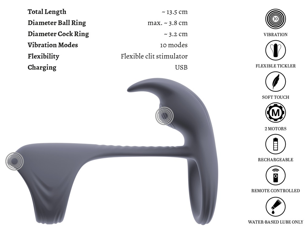 2 leise Power-Motoren sorgen für jeweils 10 Vibrationsmodi im Klitoris-Stimulator und im breiten Frontring der Penismanschette. Mit der praktischen Fernbedienung sind diese bequem per Knopfdruck getrennt steuerbar. Dank einer Reichweite von 15 Metern auch vom Partner oder der Partnerin. Die Vibrationen können auch miteinander kombiniert direkt am Toy per Knopfdruck in 10 Modi gesteuert werden.
