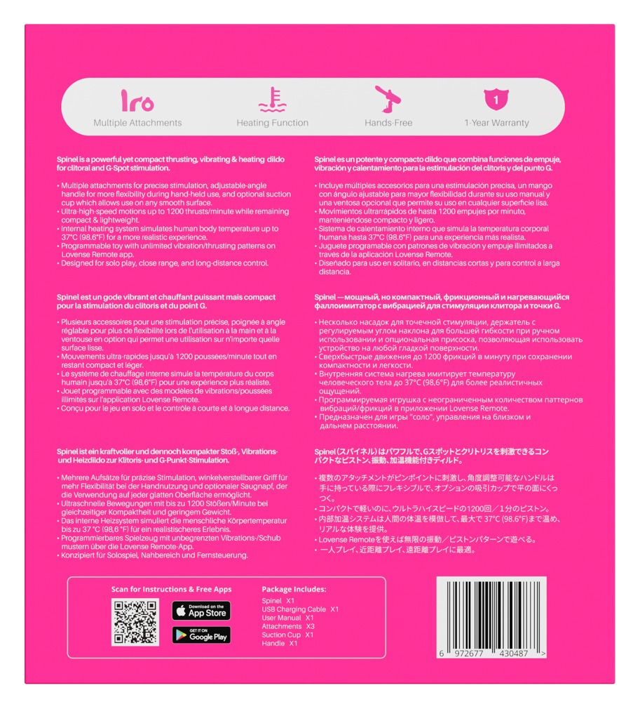 Leichter, kompakter App-Controlled Portable Thrusting Vibrating & Heating Dildo Spinel von Lovense mit Stoß-Funktion, Vibration und Wärme-Funktion. Verwöhnt mit extra starker Power und vielseitigem Zubehör auf sehr intensive, abwechslungsreiche und komfortable Weise. Beiliegender gerader Dildo-Aufsatz, der gebogene G-Punkt-Aufsatz sowie der Klitoris-Stimulator sind schnell am Basisgerät angebracht und ausgetauscht. Genauso wie der praktische Griff und der verstellbare Saugfuß. So ist für jede Lust und Laune der stylische Spinel schnell einsatzbereit – beim Spiel allein und zu zweit, zuhause und unterwegs!