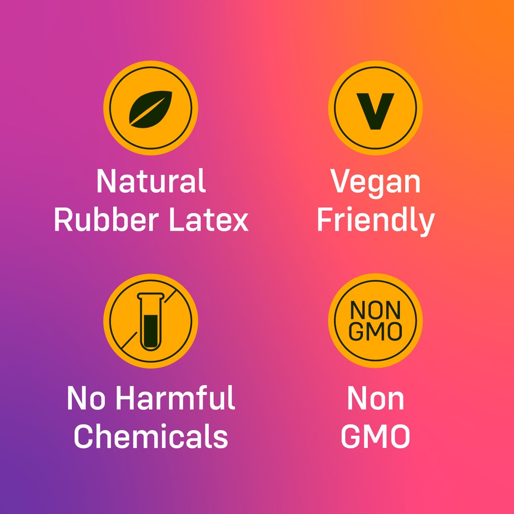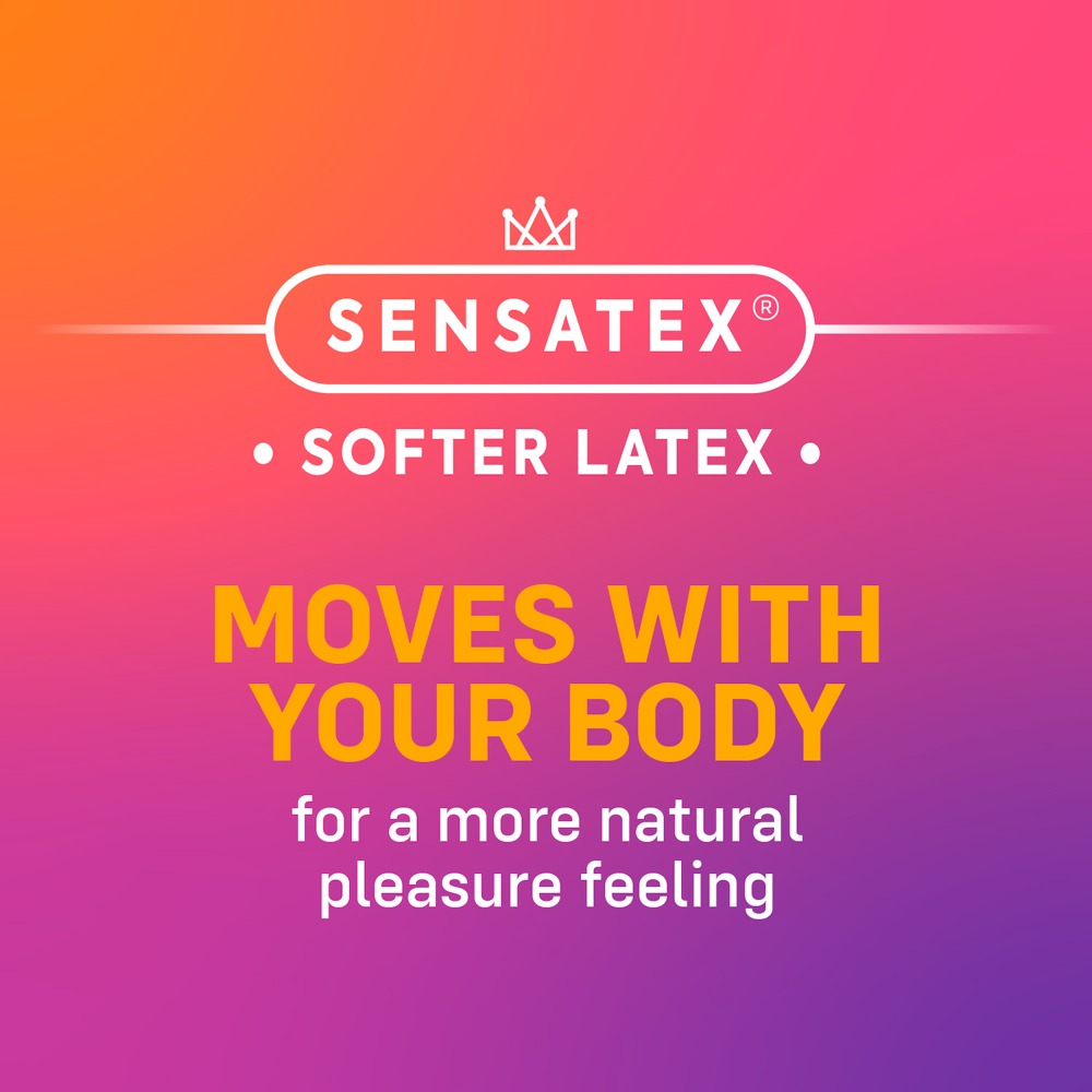 Each moistened contoured condom with reservoir provides a comfortable, secure fit. Each made of ultra-soft Sensatex natural rubberlatex for a natural sensation of pleasure. Vegan and non-GMO-free.