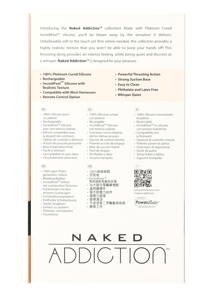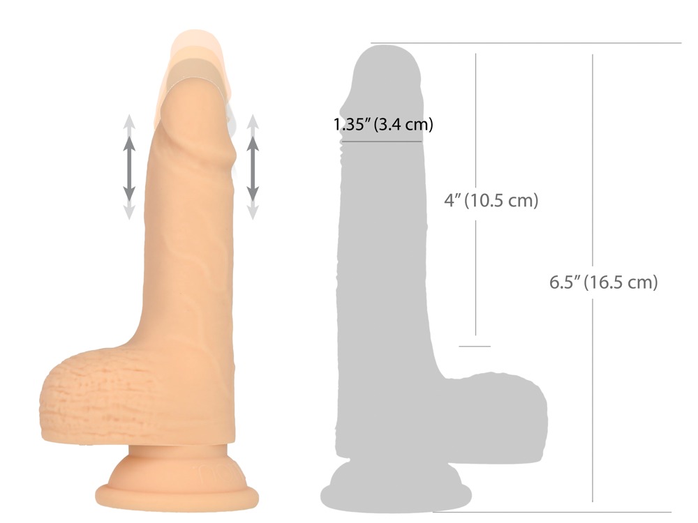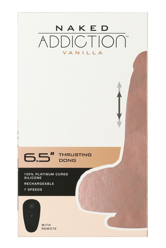 Flexible thrust 8.5" Thrusting Dong with Remote from Naked Addiction with practical remote control. In a lifelike penis look with fine veining and shaped glans. With a suction cup under the grippy testicles, which adheres firmly and securely to any smooth surface and thus enables hands-free pleasure. Thus, the dildo is also easy to use in a strap-on. The powerful, yet whisper-quiet thrust function of the dildo can be conveniently controlled with the remote control at 7 speeds. In addition, the thrust is equipped with a key lock for safe storage and transport.