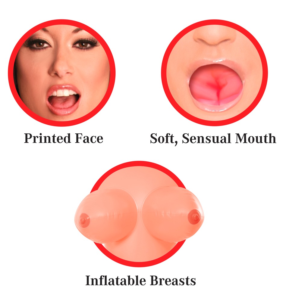 Aufblasbare Liebespuppe in stehender und umarmender Position. Ihre Vorzüge sind die großen Brüste mit den harten Nippeln sowie der weiche, sinnliche Mund. Zusätzlich hat sie 3 aufregende Liebes-Öffnungen für tiefstoßende Erkundungen. Inklusive Reparatur-Set.