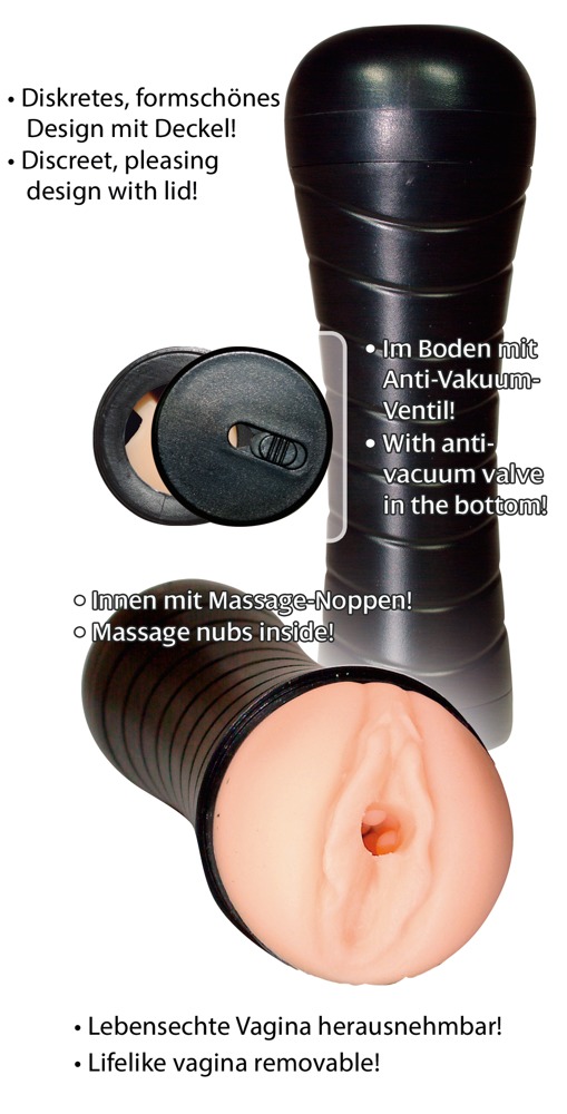Removable vagina masturbator in a black, non-slip box